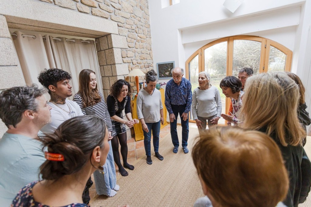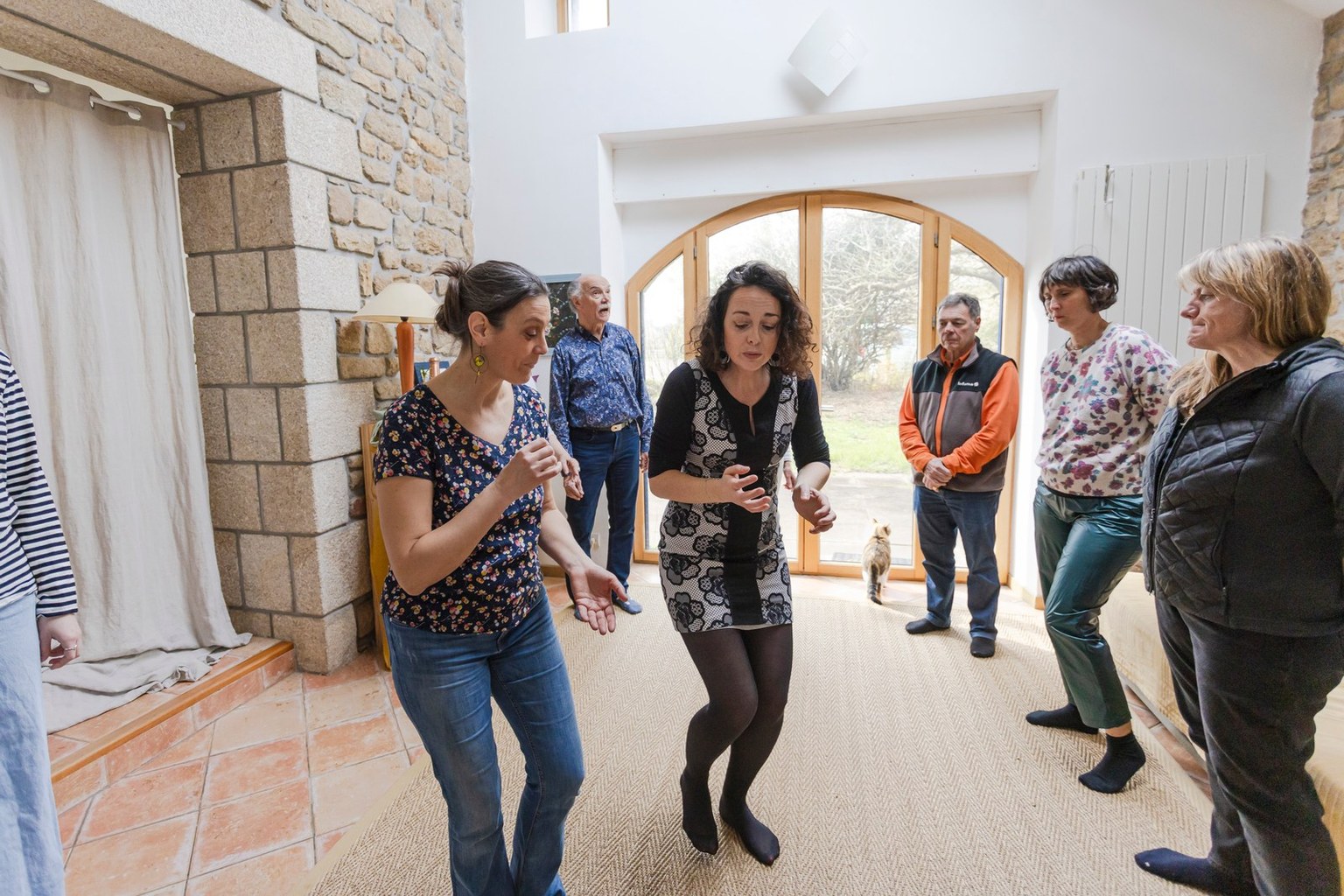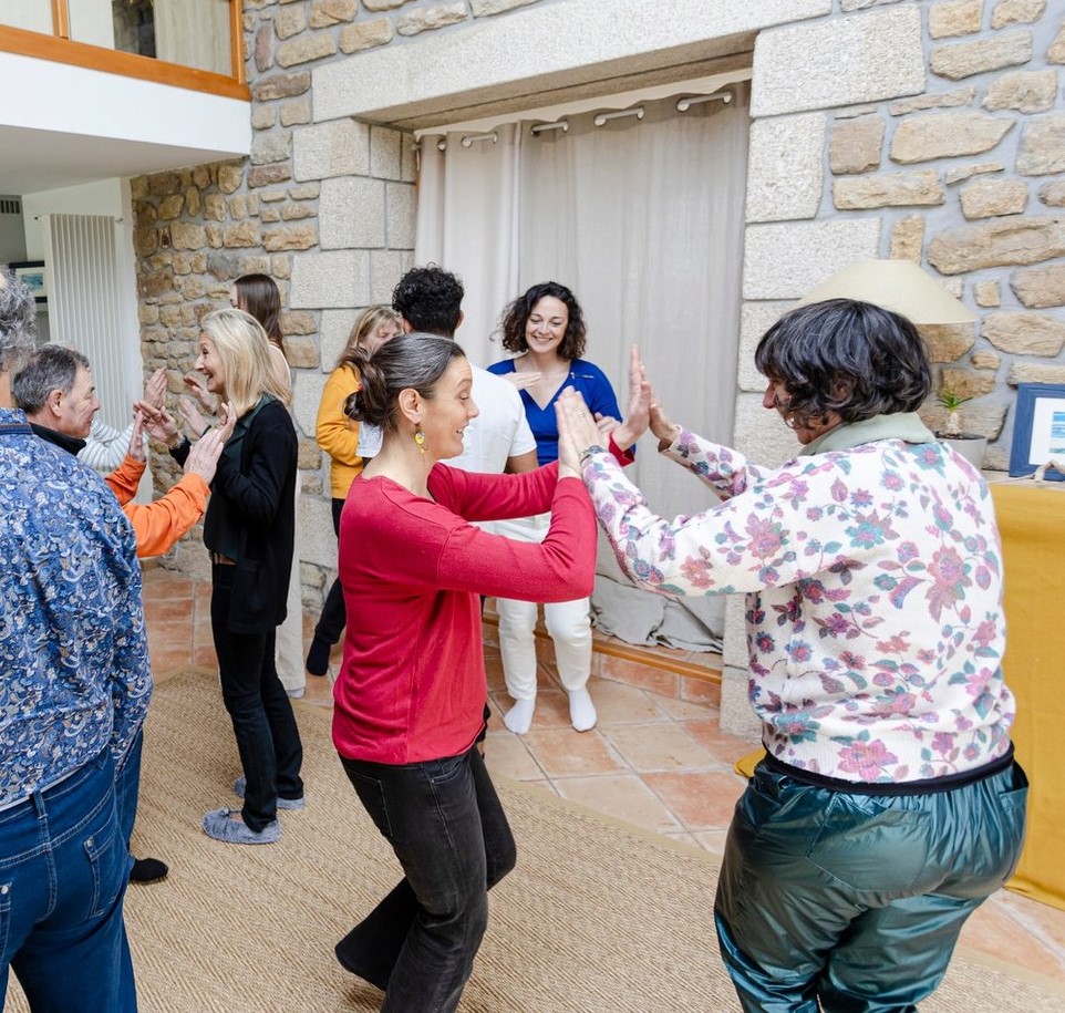 Mise en corps (réveil du corps, respiration) et mise en espace (dans le mouvement). Jeux de connexion, en rythme pour créer le climat d’échange.